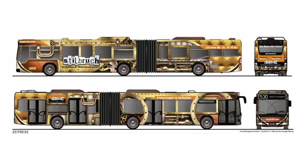 Irgendwer bei Stilbruch muss diesen Bus genauso toll finden, wie ich. Ich weiß nicht, wieviele Jahre der jetzt schon durch die Hamburger City rollt, aber es sind einige. Das Thema Steampunk fanden mein Art-Partner bei mlv und ich gut, weil wir es einerseits gut fanden und weil es andererseits eine ähnlich virtuose Mischung unterschiedlicher Zeiträume ist, die man auch bei Stilbruch im Laden findet. Das Beste aller Zeiten eben. Fun Fact: Fast wäre ich mal unter seine Räder gekommen, weil ich nicht begriffen hatte, dass der Große Burstah plötzlich keine Einbahnstraße mehr war. Das hätte ganz schön gezwickt, aber die Vorstellung, von der eigenen Idee in den ewigen Konfi befördert zu werden, die hat schon was.